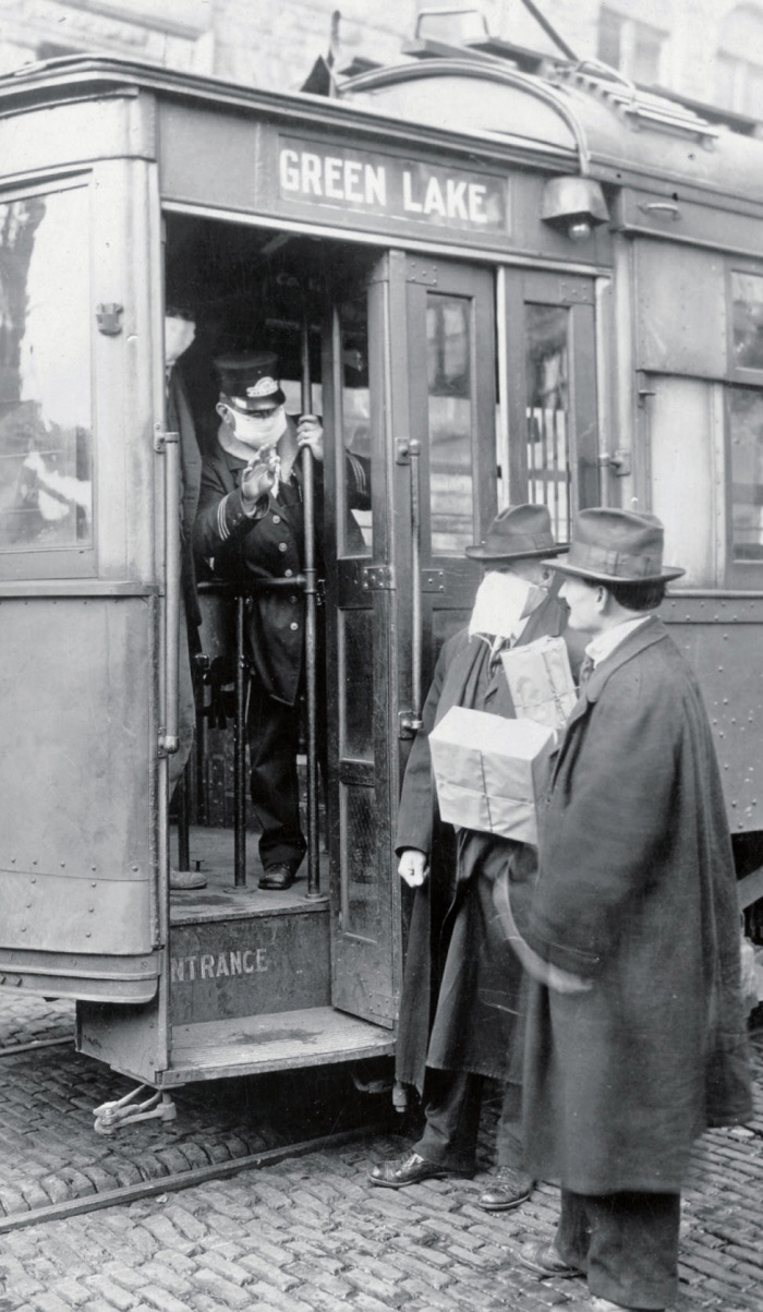1918년 미국 워싱턴주 시애틀에서는 마스크를 쓰지 않으면 전차를 탈 수 없었다. 황금시간 제공