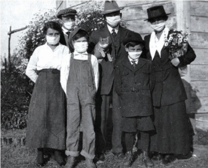 1918년 미국 캘리포니아주 더블린의 가족과 고양이. 고양이에게도 마스크를 씌운 모습이 눈길을 끈다. | 황금시간 제공