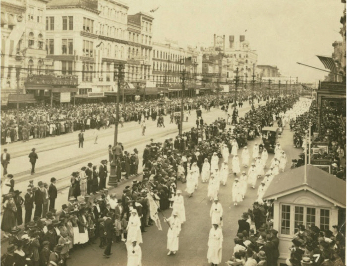 1918년 9월28일 미국 뉴올리언스 캐널스트리트에서 펼쳐진 제4차 자유 국채 운동 퍼레이드에 참가한 간호사들. 보건 당국의 만류에도 불구하고 퍼레이드가 진행됐으며 많은 군중이 운집했다. 황금시간 제공