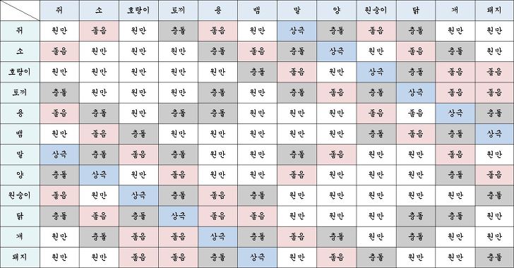 이제 위 조견표를 토대로 띠별 궁합이 어떤지 각 십이지별로 심층 분석 해보겠습니다.